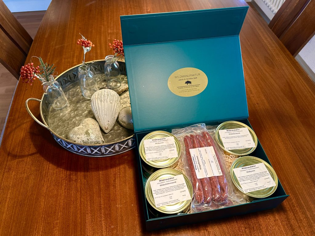 Ab sofort bieten wir Ihnen Geschenkboxen mit feinen Köstlichkeiten der Wildmanufaktur an. Für jeden Anlass ein passendes und stilvolles Geschenk in einer hochwertigen wiederverwendbaren Box mit Magnetverschluss. Die Geschenkboxen sind in 2 Varianten erhältlich ; 30,00 EUR oder 50,00 EUR.